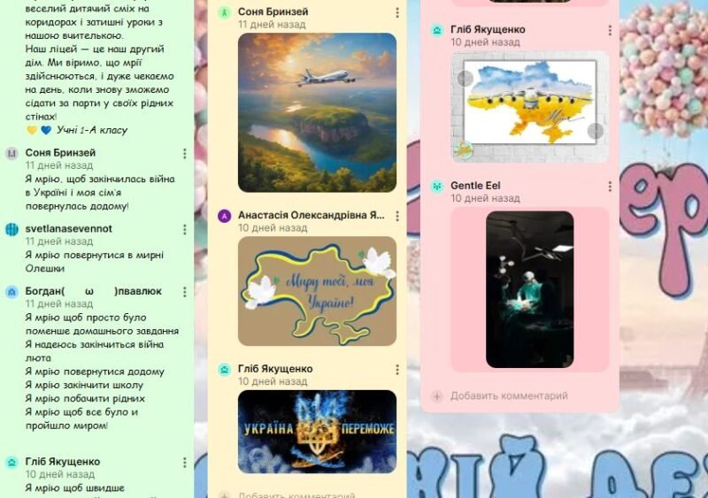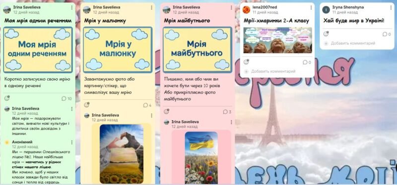 Було створено інтерактивну платформу для вільного самовираження учнів — дошку Padlet, де вони мали можливість розміщувати свої роботи у формі текстів, фото, малюнків та стікерів. Такий формат сприяв підвищенню зацікавленості школярів у спільних подіях, що мають значення для їхнього емоційного та творчого розвитку.