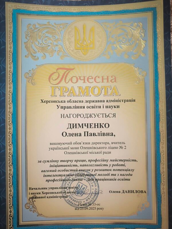 Педагогічний та учнівський колективи щиро вітають в.о. директора ліцею Олену Павлівну Димченко з врученням їй Почесної грамоти управління освіти і науки Херсонської ОДА з нагоди Дня працівників освіти!