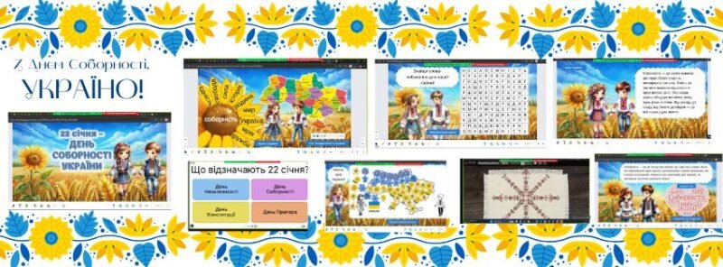 22 січня 2026 року у 6-Б та 9-Б класах Олешківського ліцею №2 відбувся тематичний урок української мови, присвячений Дню Соборності України. Захід підготувала та провела вчитель української мови Димченко Олена.