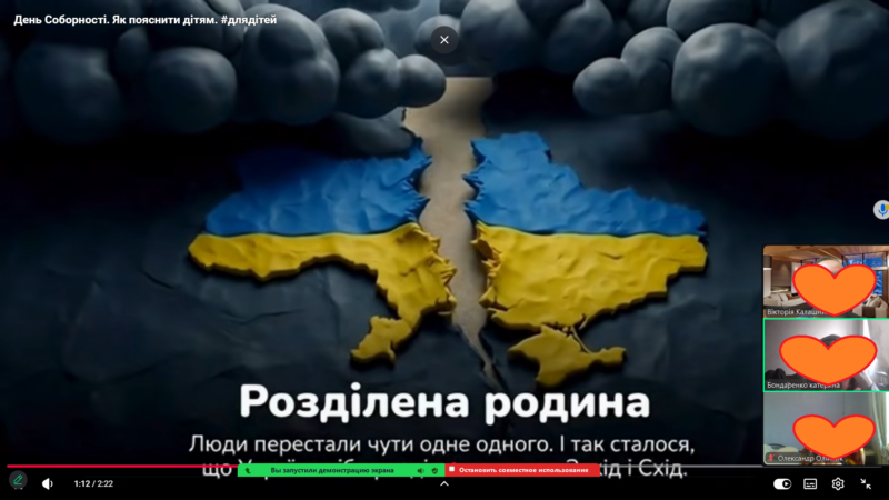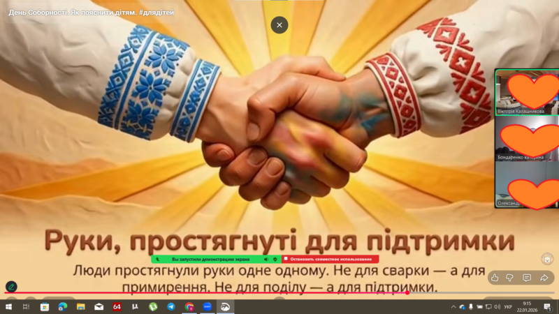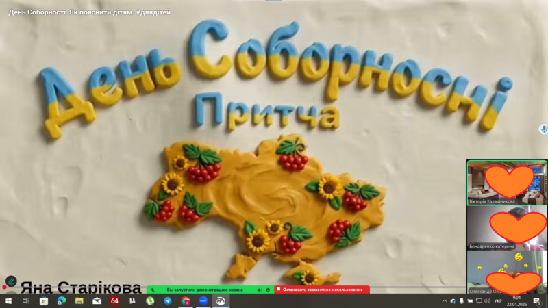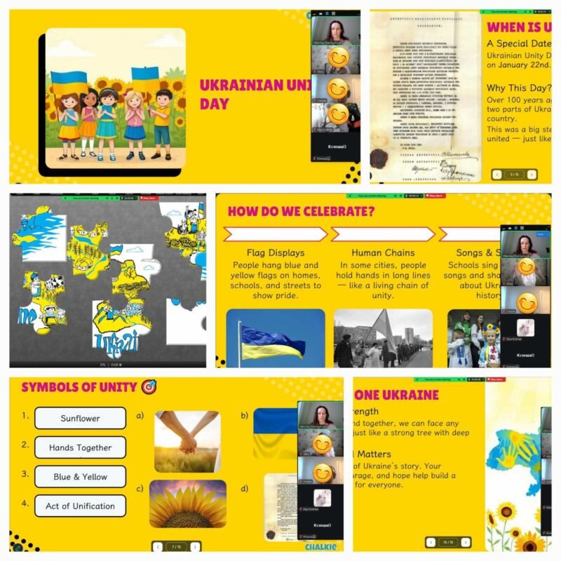 Під час уроку учні разом із вчителем гортали сторінки історії нашої держави, пригадуючи важливі події, що стали символом єдності українського народу. Особливу увагу було звернено на те, що у 2026 році Україна відзначає 107-му річницю проголошення Акту Злуки — об’єднання Української Народної Республіки (УНР) та Західноукраїнської Народної Республіки (ЗУНР), яке відбулося 22 січня 1919 року на Софійському майдані в Києві.