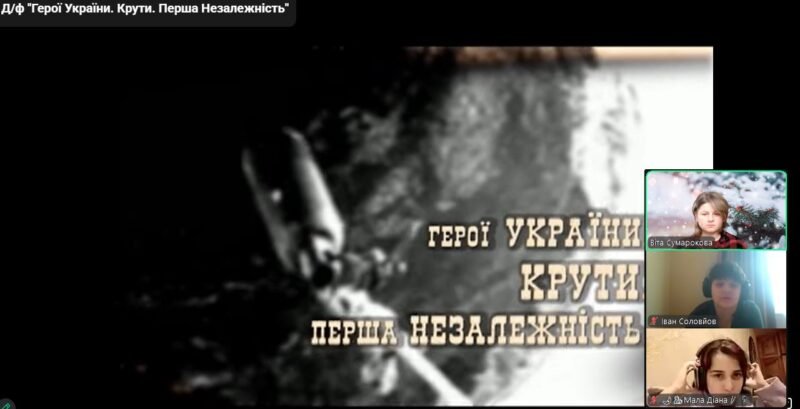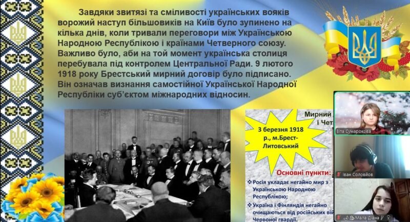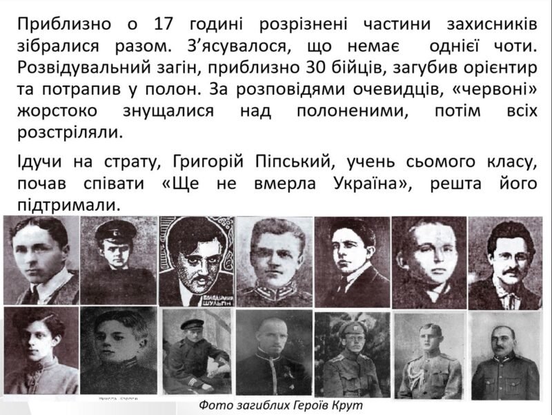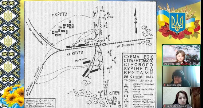 Ознайомилися з історичною довідкою подій, з причинами бою, схемою бою студентів, визначними особами, які відзначилися в бою під Крутами. Обговорили пункти Брестського мирного договору і їх наслідки для України. По закінченню уроку переглянули уривки документального фільму “Герої України. Крути. Перша Незалежність”. На домашній перегляд учням рекомендувався перегляд фільму Олексія Шапарєва “Крути 1918”