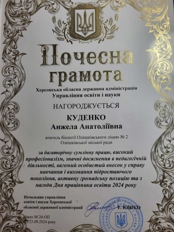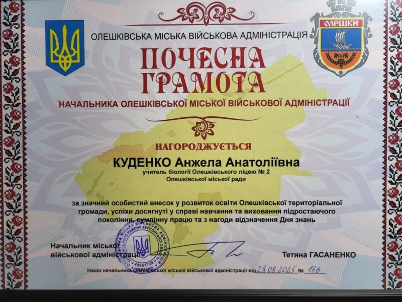 🏅 Почесної грамоти начальника Олешківської міської військової адміністрації – за значний особистий внесок у розвиток освіти громади, успіхи у справі навчання та виховання підростаючого покоління.