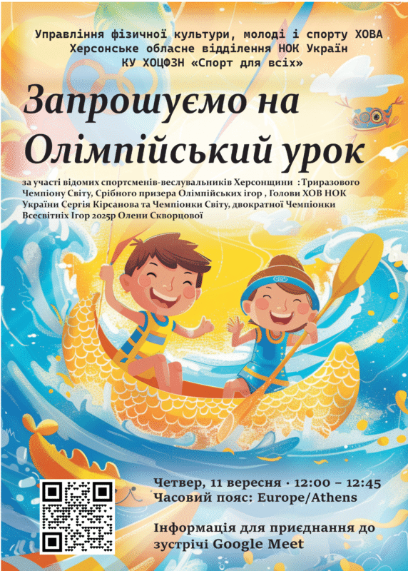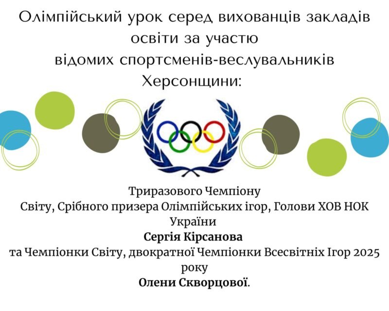 Олімпійський урок серед вихованців закладів освіти за участю відомих спортсменів- веслувальників Херсонщини став важливою подією для учнів. Під час цього уроку учні мали можливість поспілкуватися з легендами веслування, отримати надихаючі розповіді та побачити відеоматеріали з їхніми досягненнями.