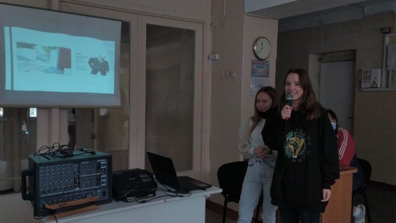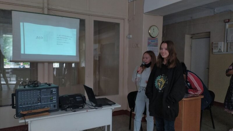 Середа: На першому поверсі після 4-го уроку була показана презентація. Там дівчата показали випадки вандалізму в місті Олешки, кумедно коментуючи їх.