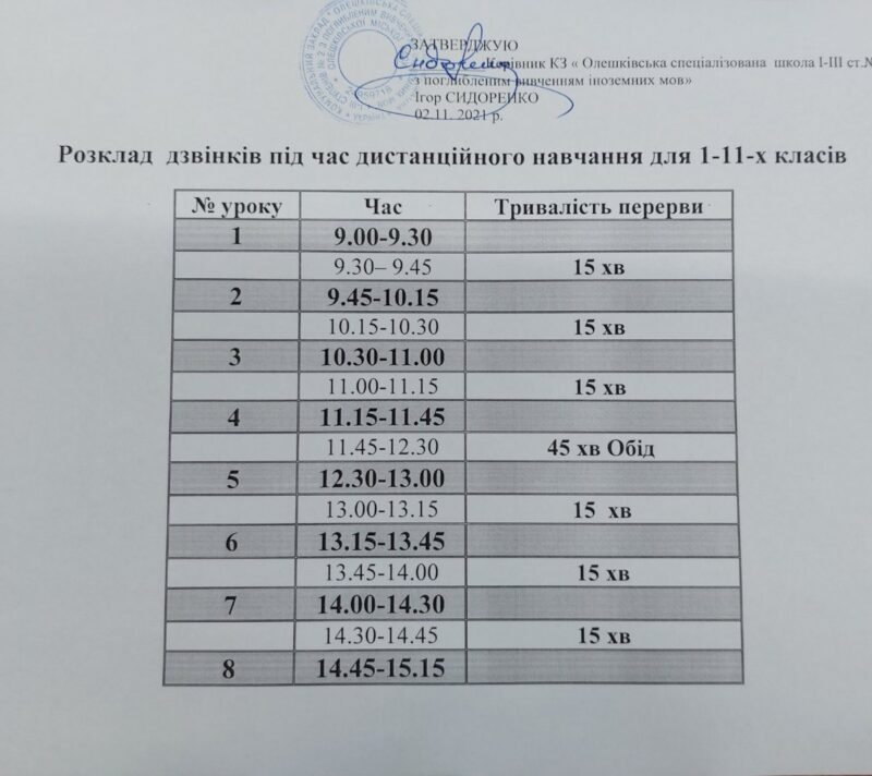 З 03 листопада 2021 р. освітній процес у 1-11-х класах організовується у дистанційній формі.