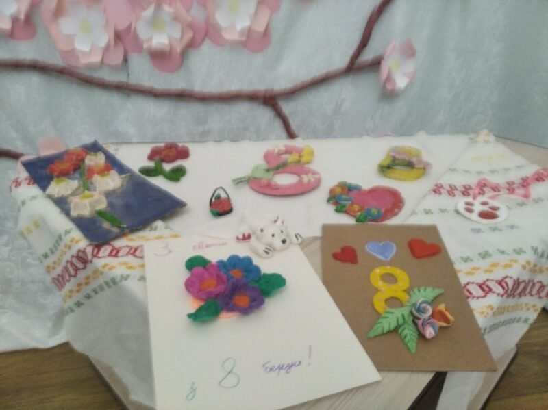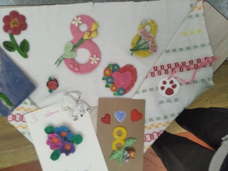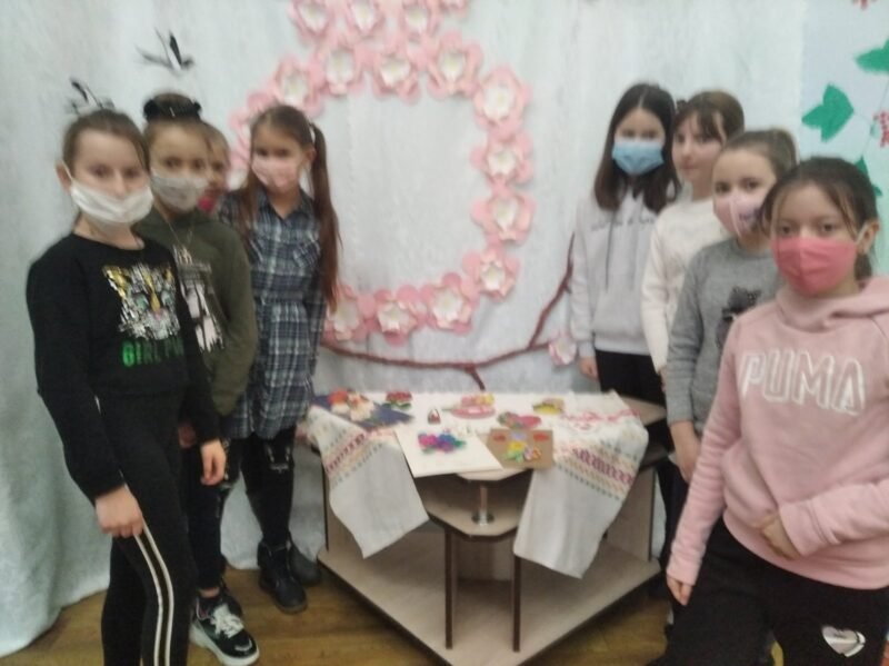 Учасники гуртка “Виготовлення сувенірів” разом з керівником Надточий Л.А. вітають мам, жіночу половину педколектива, всіх дівчат школи з 8 Березня