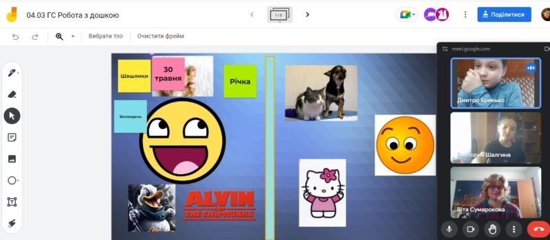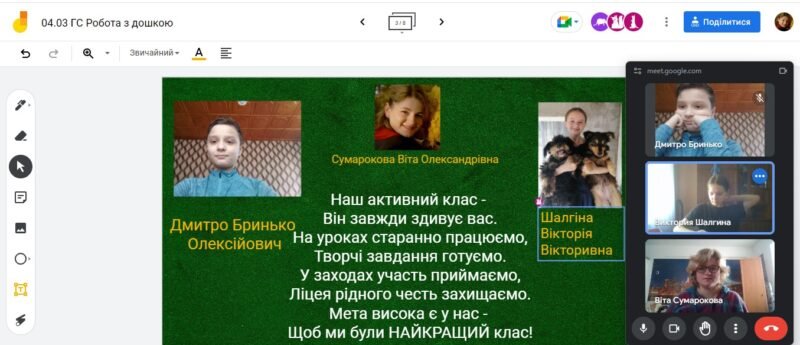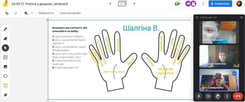 4 березня в 6-Г на годині спілкування учні набували практичних навичок роботи з дошкою Jamboard. Віта Олександрівна ознайомила учнів з інтерфейсом програми. Також спробували застосування кожного із інструментів. В підсумку – заповнили схему “Руки допомоги Україні”